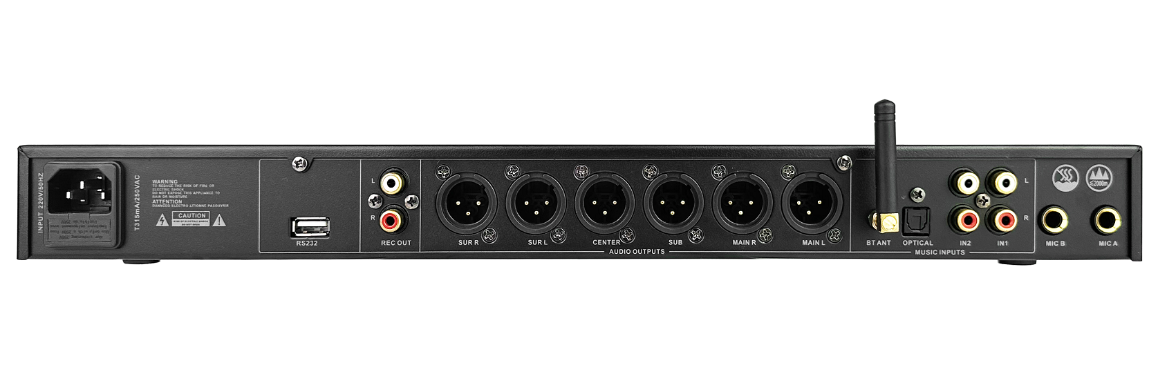 话筒AB路独立各10段参量均衡可调,音乐7段参量均衡,5级反馈抑制功能